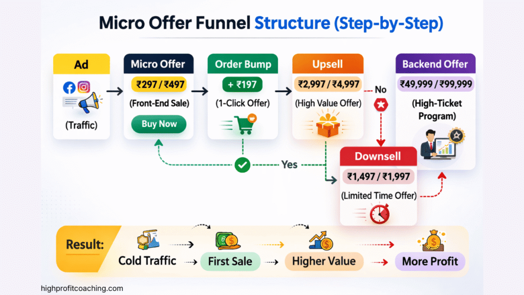 A micro offer funnel monetizes cold traffic upfront before pitching high-ticket programs.